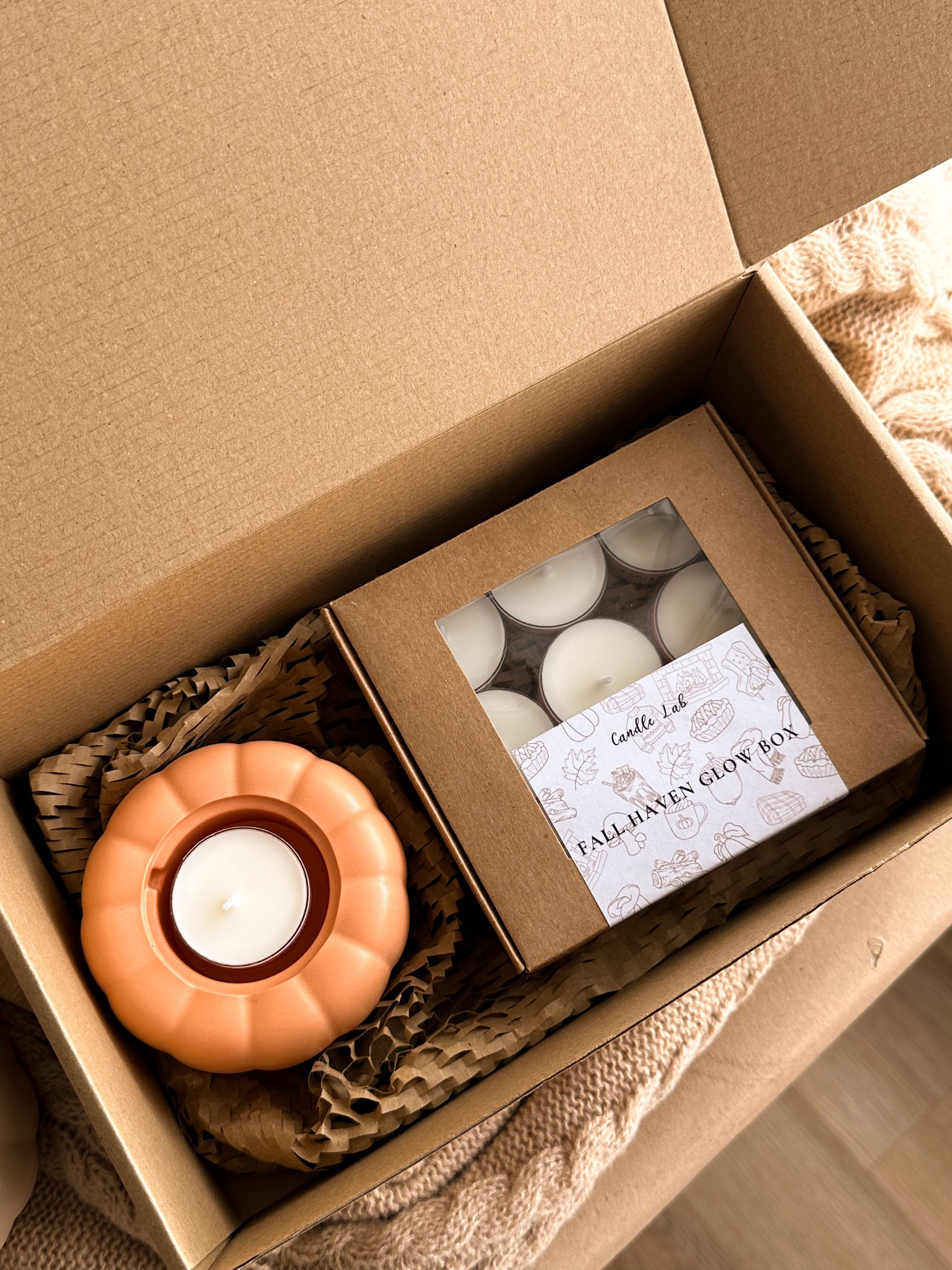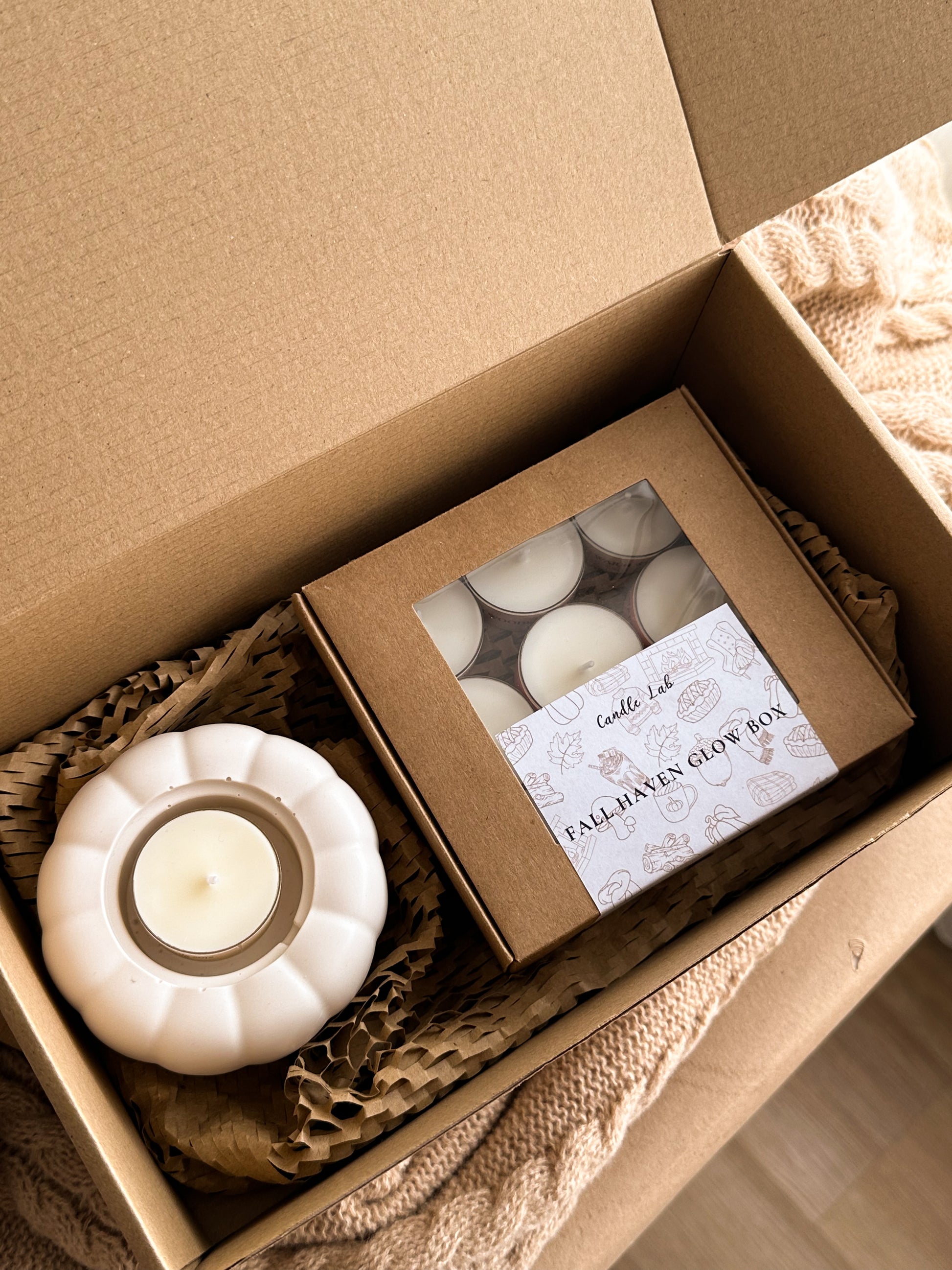A Fall Haven Glow Box é composta por 3 aromas, com 3 velas de chá cada.