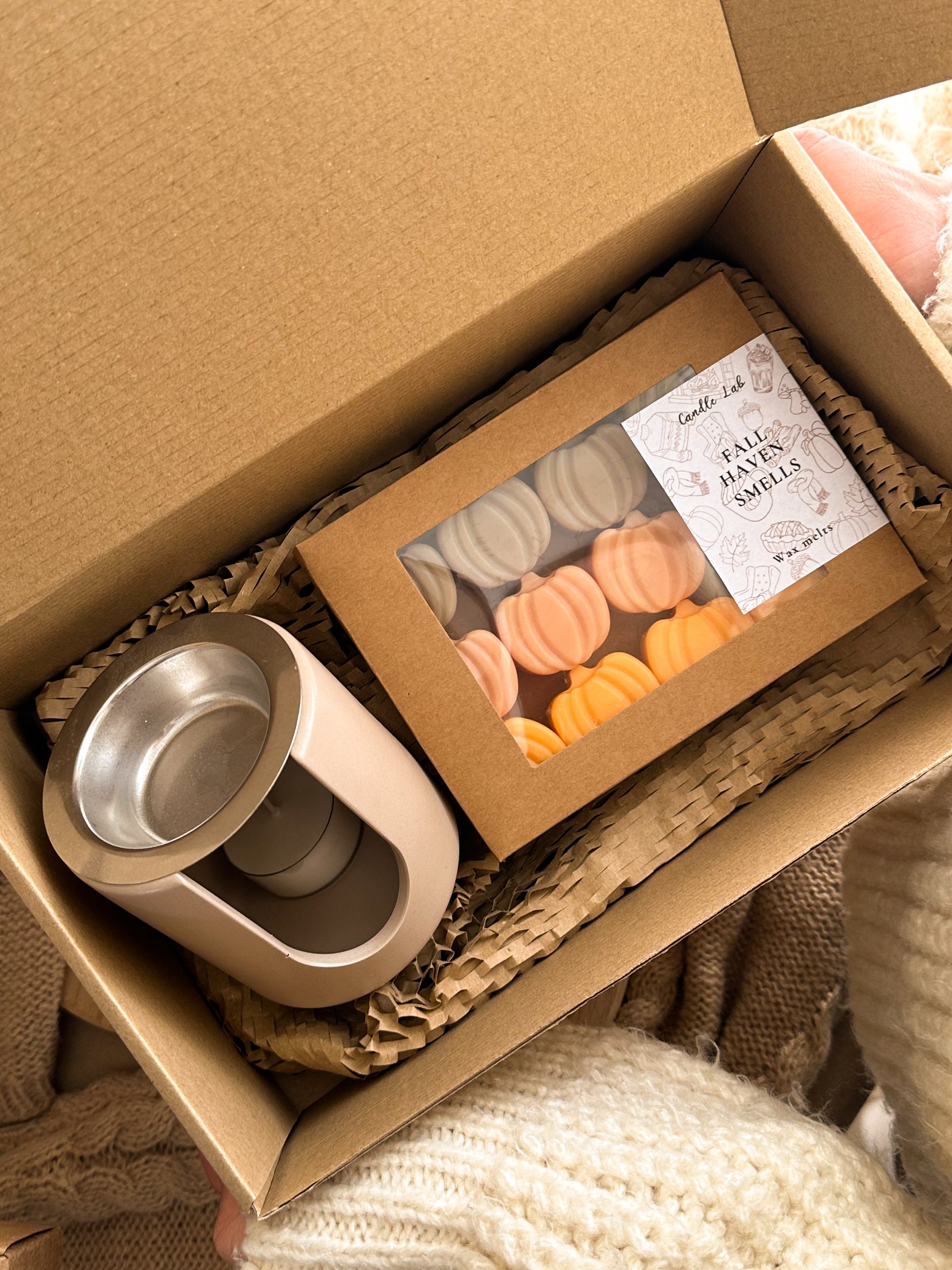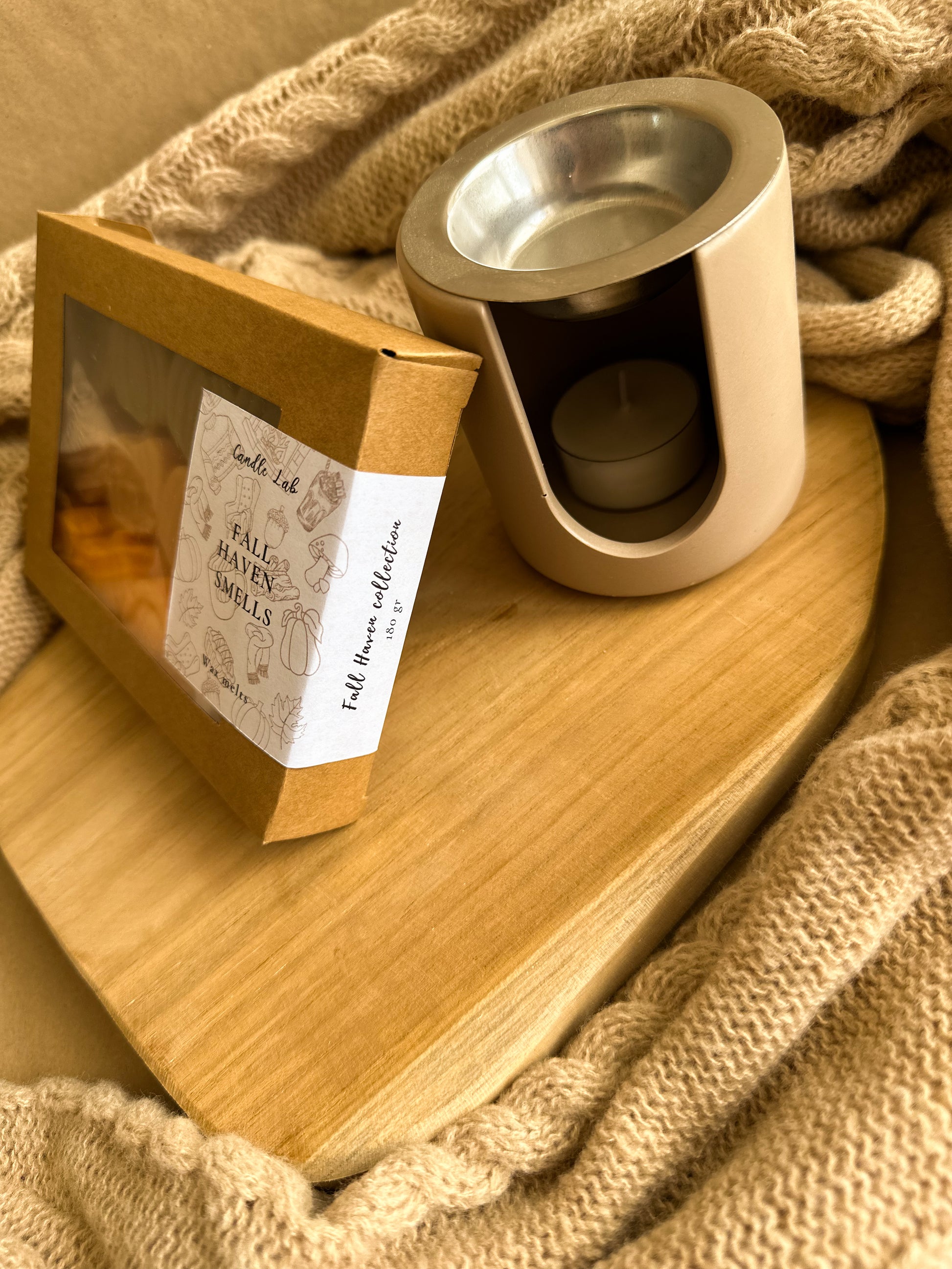 Pack composto por queimador, Wax melts abóbora, 2 velas de chá e oferta de frasco de fósforos.