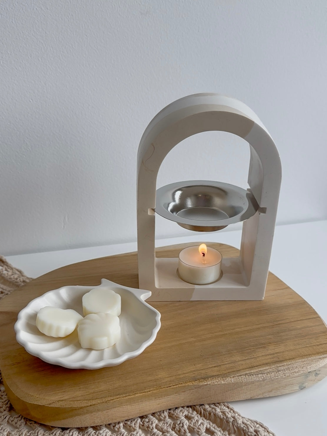 Pack queimador maior composto por queimador com bandeja de metal, wax melts (80g ou 120g) e 2 velas de chá.