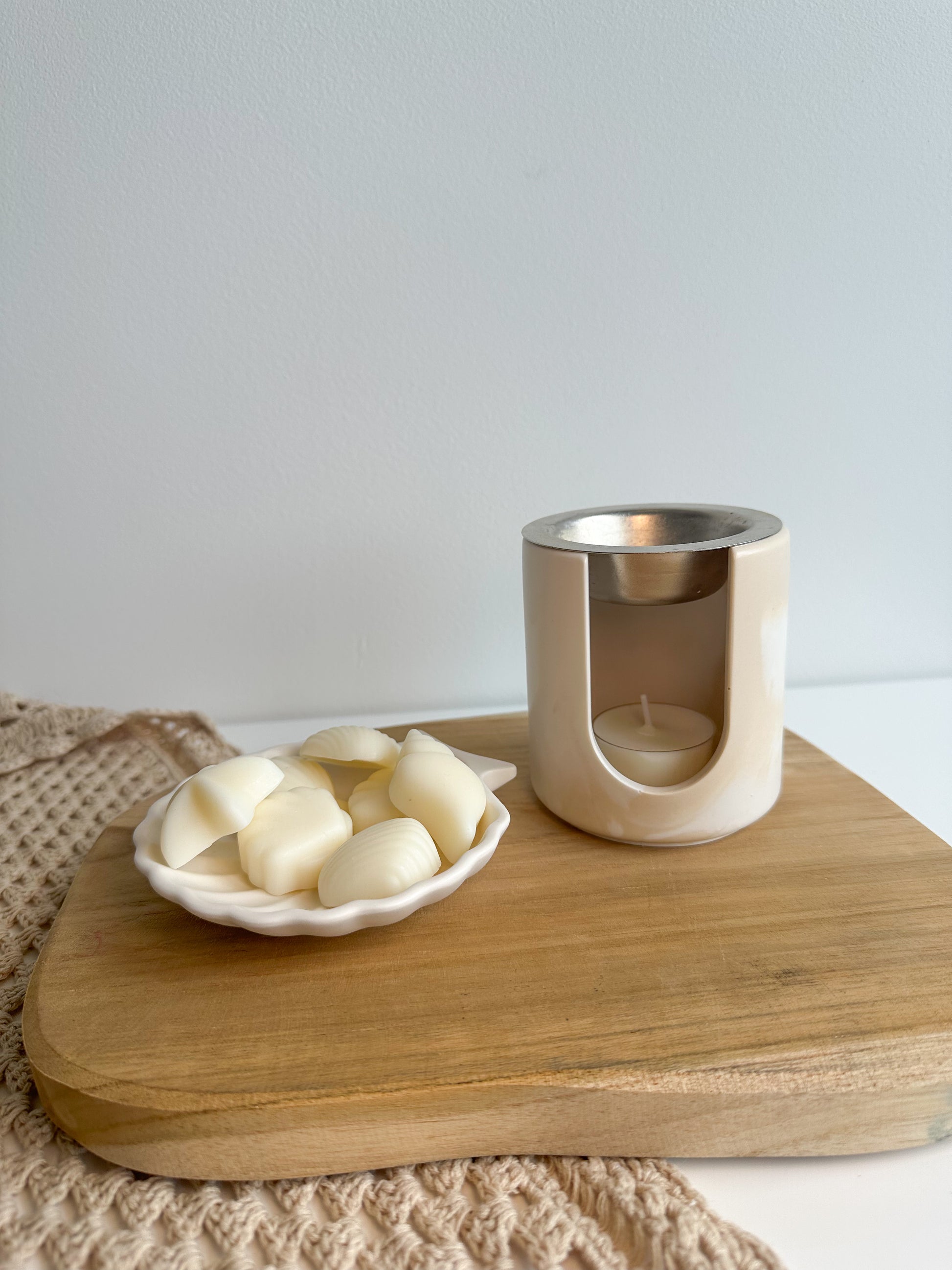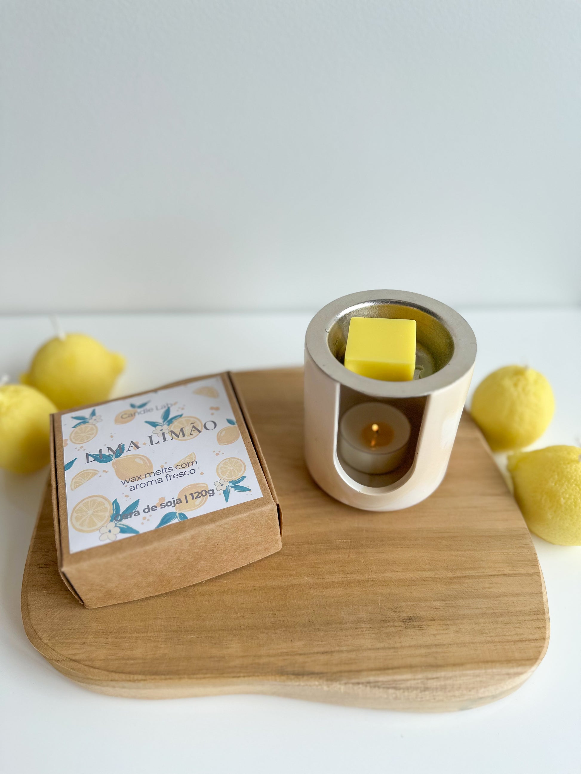 Pack queimador menor, composto por queimador com bandeja de metal, wax melts (80g ou 120g) e 2 velas de chá.