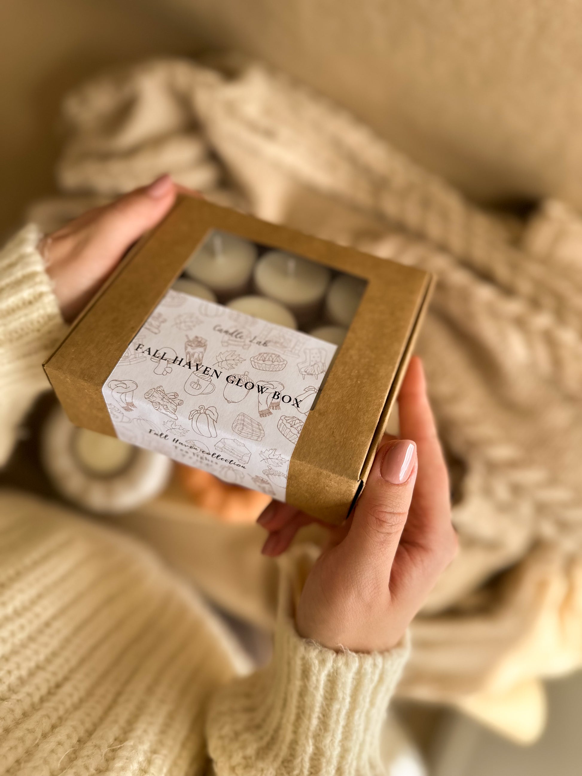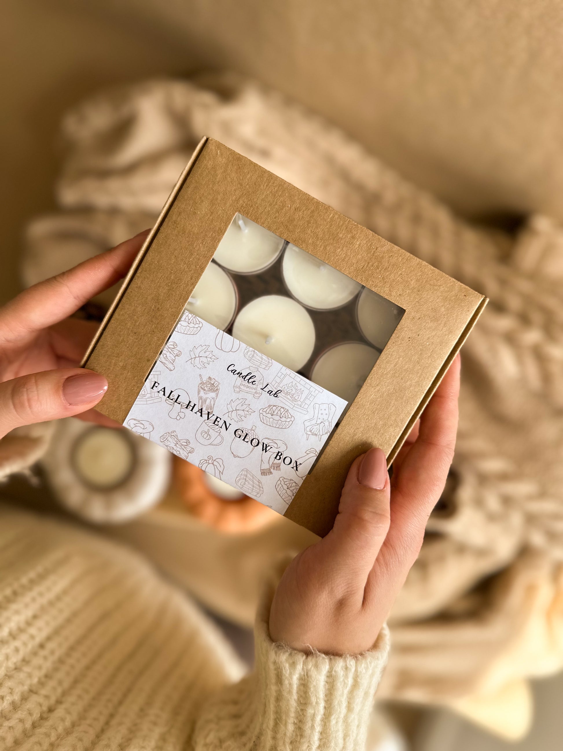 A Fall Haven Glow Box é composta por 3 aromas, com 3 velas de chá cada.